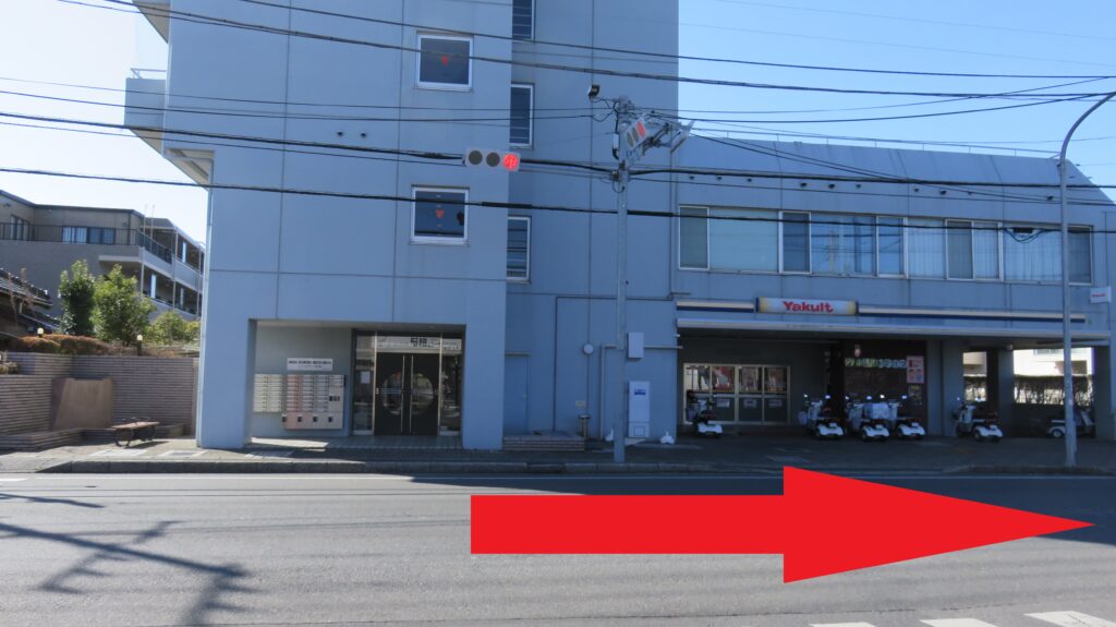 その突き当りの大通りを右に曲がると4.の交差点に出ることができます。