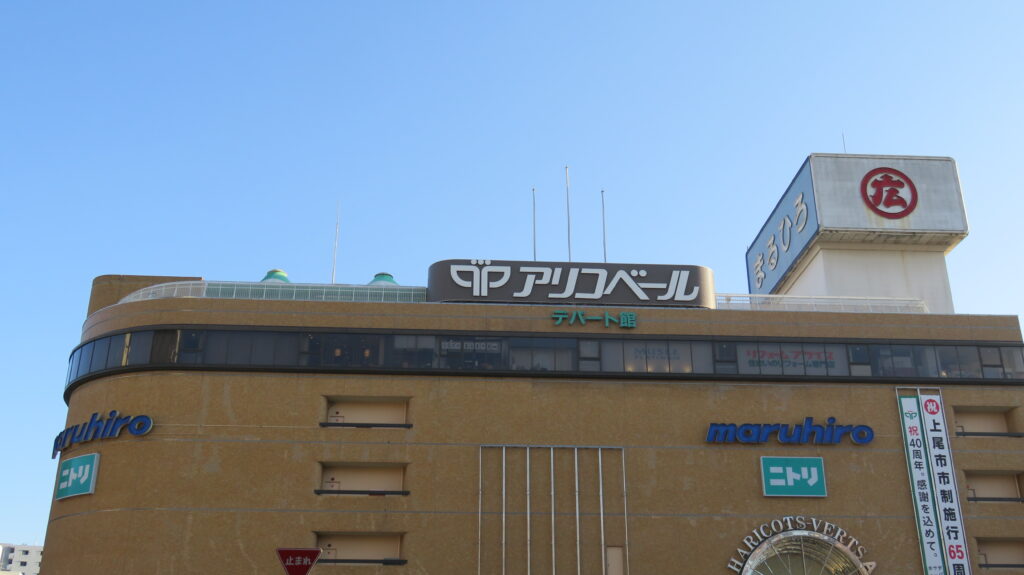 上尾駅は駅周辺にもある丸広百貨店やイトーヨーカドーなどある程度商業施設が集積しています。このほかにスーパーのヤオヒロがあるため食料品等は駅前でも買い物に困りません。家電量販店は駅の南東約1.5kmの場所にあるイオンモール上尾にあるノジマか、その手前にあるヤマダ電機まで行くことになります。